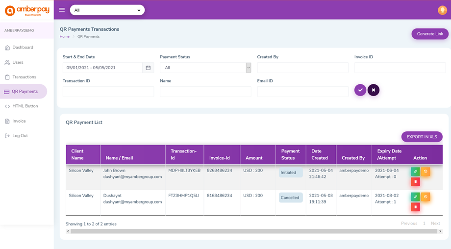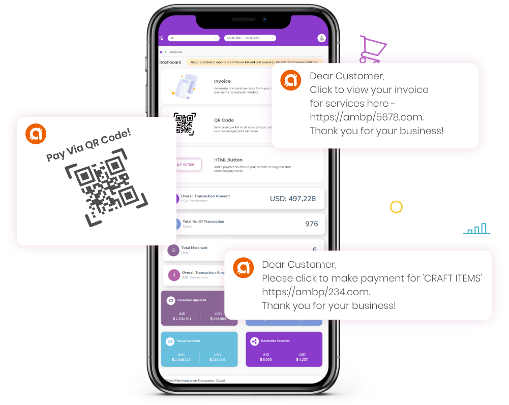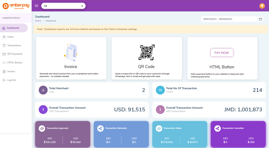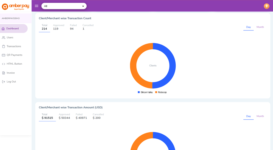 Amber Pay eLink provides a dashboard with transaction analytics, where merchants can monitor transactions and export reports for any time period.